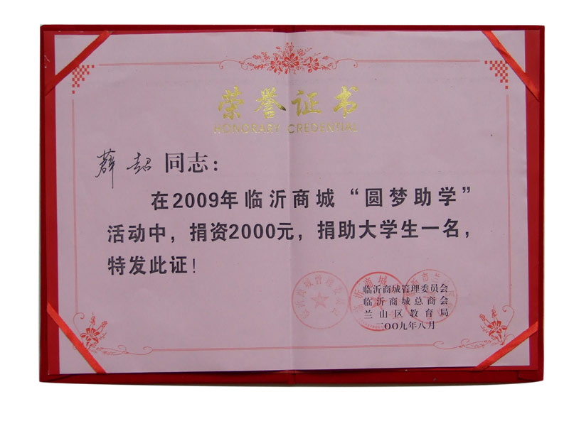 董事長薛超助學(xué)證書